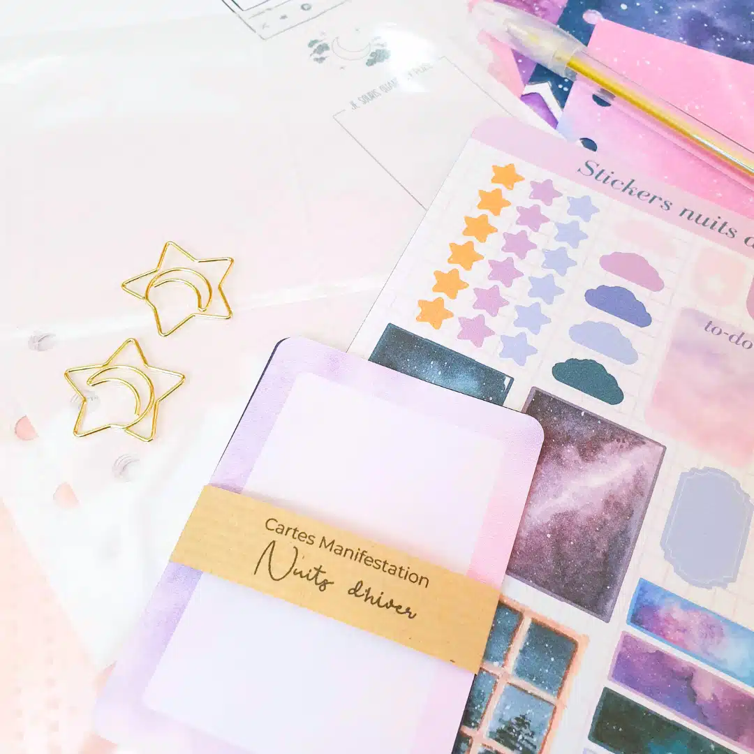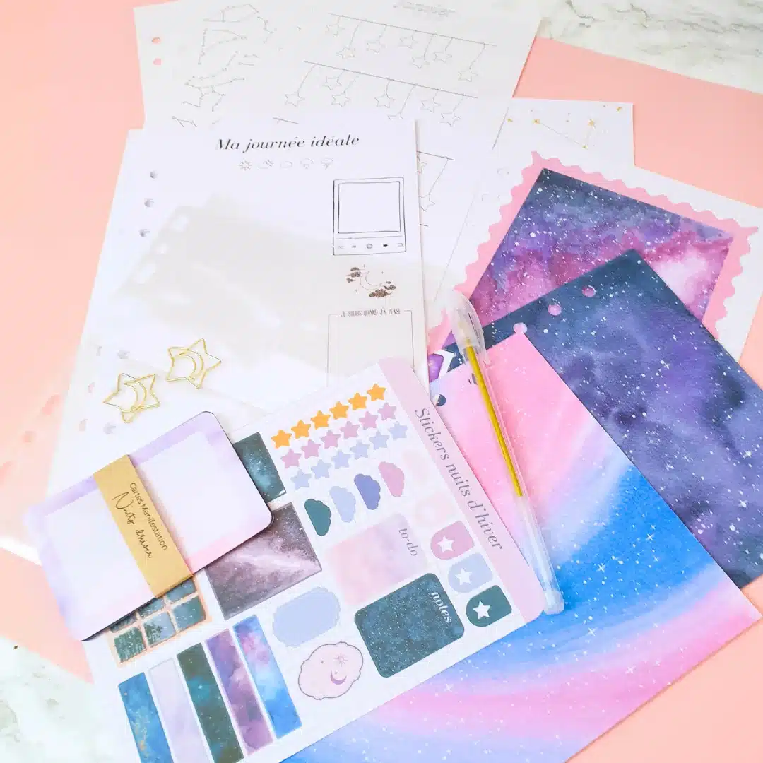 - 1 carnet d’activité sur le thème de la box : Journal de rêves, tracker de sommeil, coloriage, rituels du soirs,…